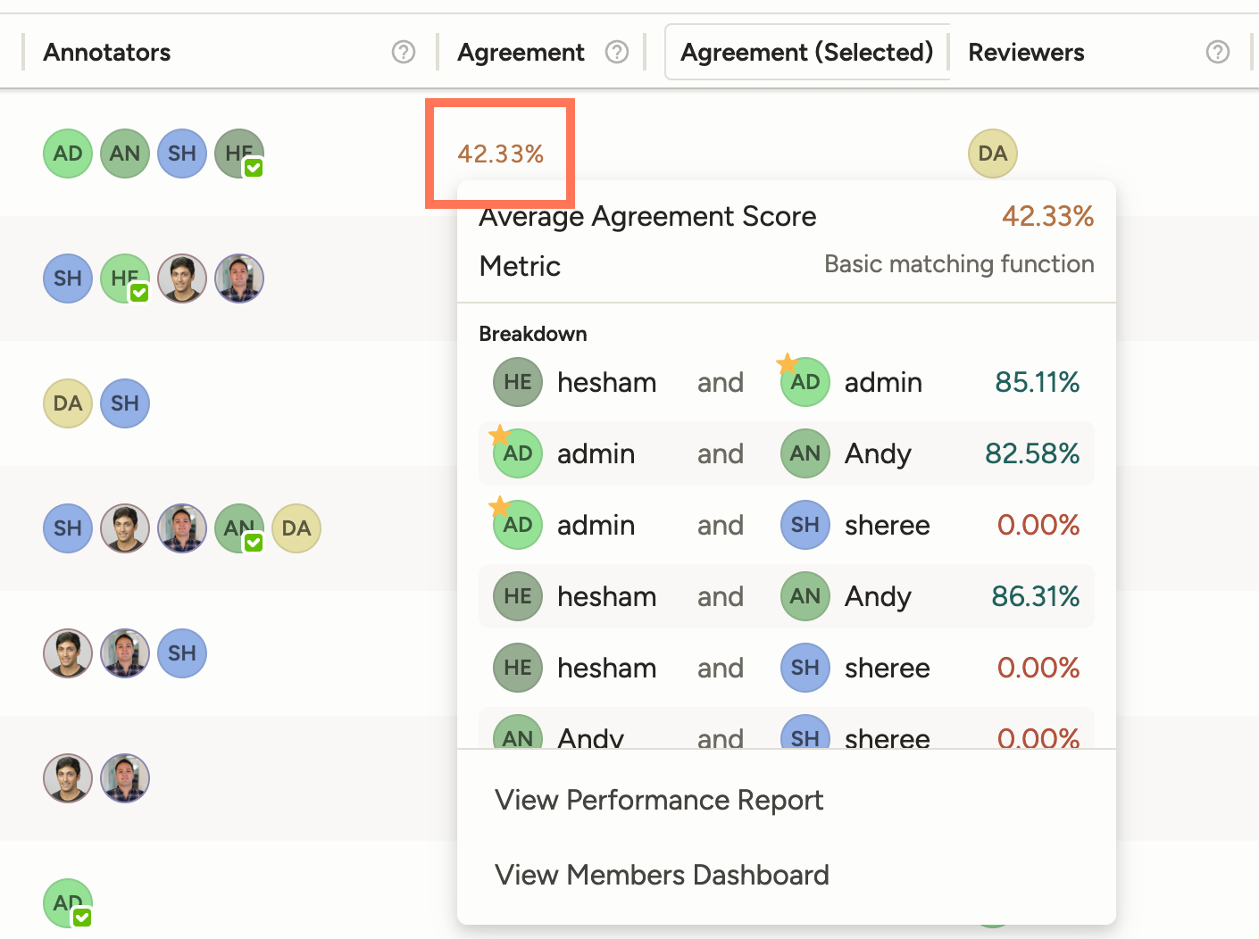 Hover over the Agreement column to view a pop-over showing inter-annotator agreement. Annotations that have been marked ground truth are indicated with a star icon ⭐️:
